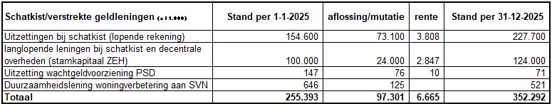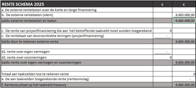 De overige overtollige middelen zijn op de lopende rekening schatkistbankieren gestald. De rente op schatkistbankieren is gedurende 2025 stapsgewijs verlaagd van 2,92% naar 1,93%. De rente op de lopende rekening kan dagelijks wijzigen maar volgt in grote lijnen de tarieven van de Europese Centrale Bank (ECB)