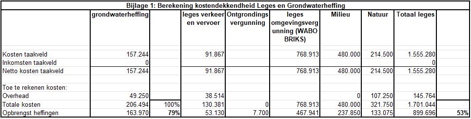 Het uitgangspunt is dat de opbrengsten van zowel heffingen als leges niet hoger mogen zijn dan de lasten die betrekking hebben op de activiteiten. Tot de lasten worden gerekend alle materiële kosten en de salarislasten inclusief overhead die betrekking hebben op de heffing. In 2025 heeft een evaluatie plaatsgevonden met betrekking tot bouwleges en tarieven zijn aangepast.