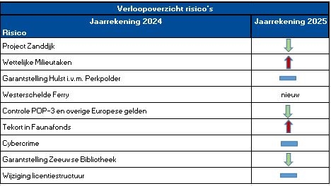 In bovenstaand overzicht staan de risico’s in volgorde van invloed. De risico’s met betrekking tot project Zanddijk, Wettelijke milieutaken en Garantstelling Hulst i.v.m. Perkpolder bepalen het grootste deel (85,2%) van het risicoprofiel van de provincie.