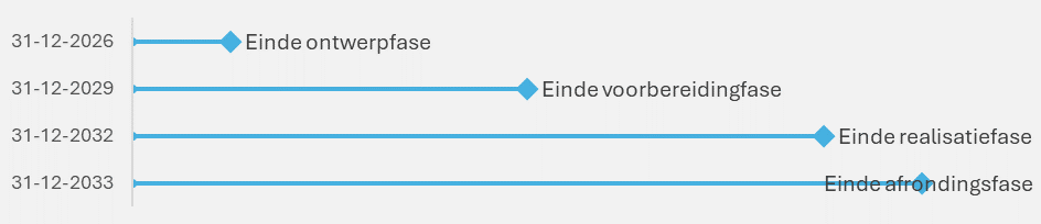 Bij de overgang van de definitiefase naar de ontwerpfase is een planning gemaakt van de volgende fasen. Voor de planning van de verschillende projectfasen van het project is een inschatting gemaakt van de looptijd. De ontwerpfase staat gepland voor dit jaar. Daarbij is de planning nu dat in het vierde kwartaal van dit jaar de faseovergang naar de voorbereidingsfase zal plaatsvinden.